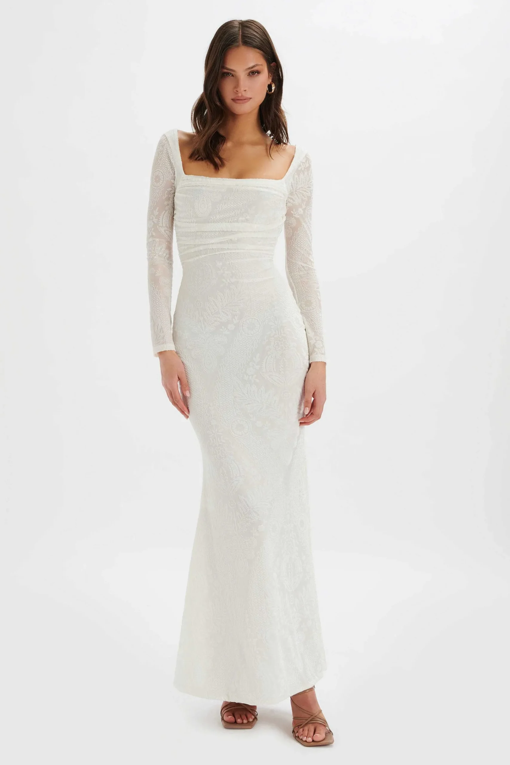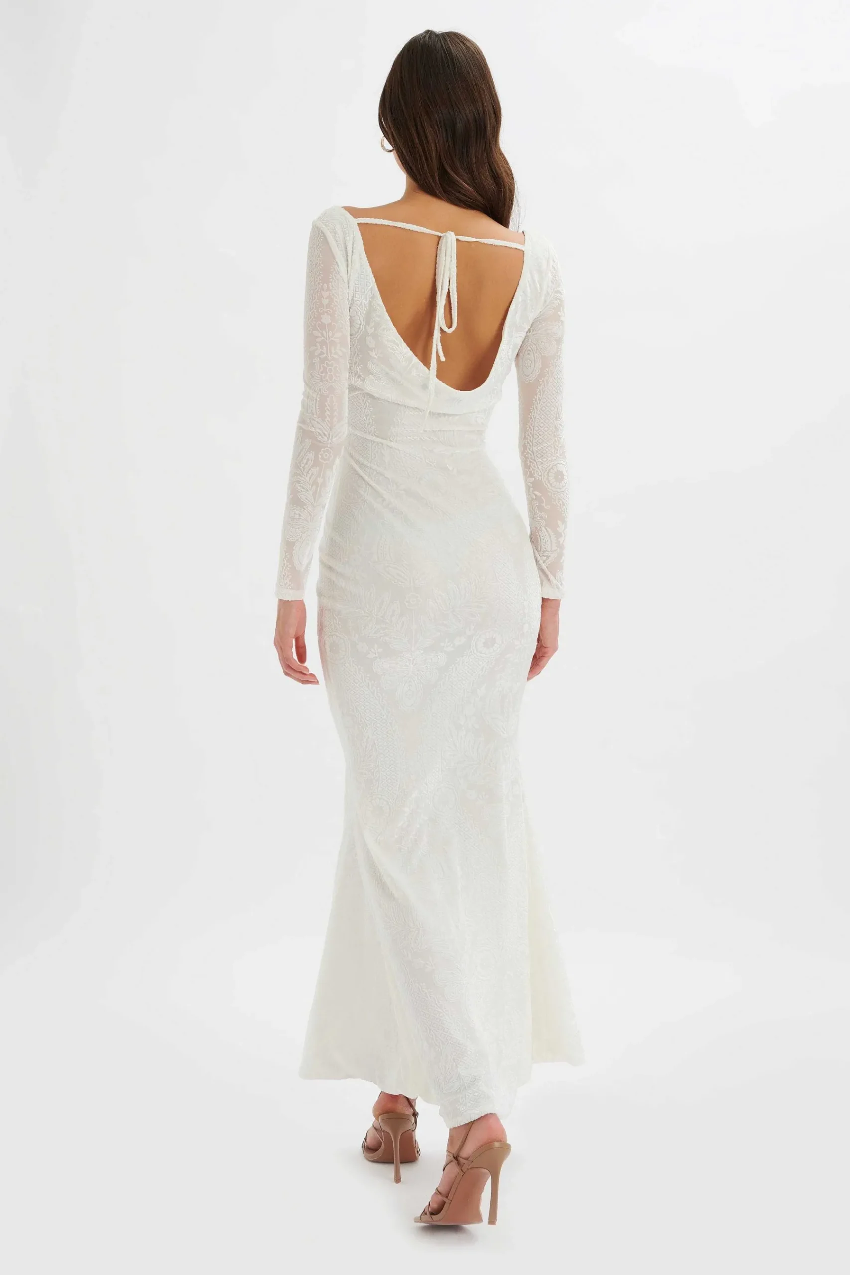Indulge In The Sheer Elegance Of The Betsy Burnout Stretch Devore Drape Back Maxi In White, Meticulously Crafted From Premium Stretch Devoré Fabric. Its Graceful Silhouette Effortlessly Embraces Your Curves, Accentuating Your Figure With Unparalleled Allure. The Addition Of The Low Cowl Back Infuses A Touch Of Stylish Sophistication, While The Delicate Pleat Detailing On The Waist Enhances The Fit And Flare Silhouette. Perfect For Spring And Summer, This Soft And Luxurious Maxi Is A Must-Have Addition To Any Wardrobe.