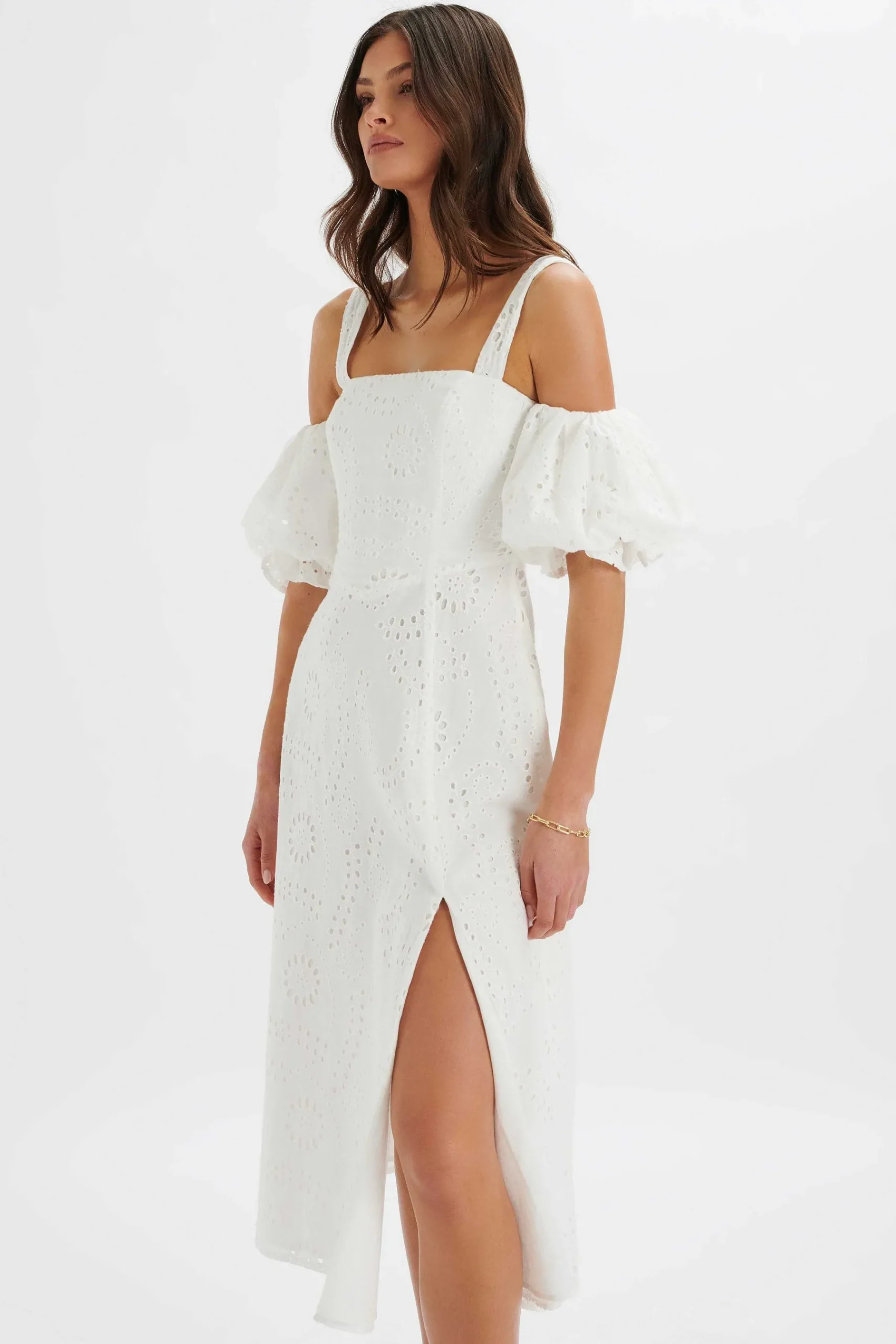 Expertly Crafted From Premium Broderie Fabric In A Crisp White Hue, The Charli Off Shoulder Dress Exudes A Sense Of Effortless Elegance. The Balloon Puff Sleeves And Bardot Neckline Add A Touch Of Femininity, While The Midi Skirt With A Side Split Flatters Any Figure. Perfect For Spring And Garden Parties.