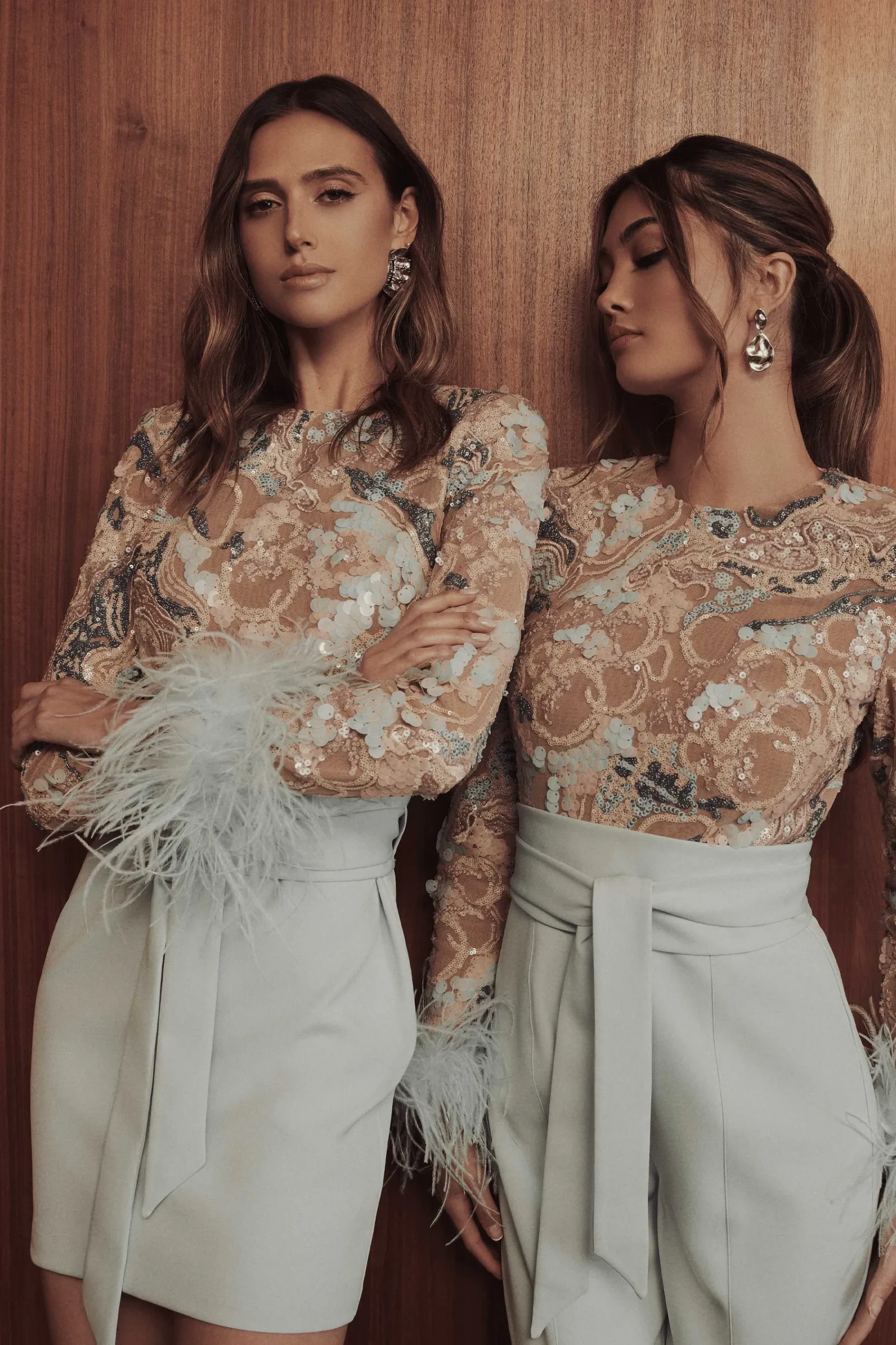 This Medina Mini Dress Is A Masterpiece With Its Mixed Sequin Embellishments, Delicate Ostrich Feather Cuff, And High-Quality Crepe Skirt In Pastel Blue. The Concealed Shoulder Pads And Waist-Cinching Obi Belt Create A Flattering Silhouette, While The Double-Layer Nude Power Mesh Lining Adds Functionality. A Must-Have For A Close-To-Body Fit.
