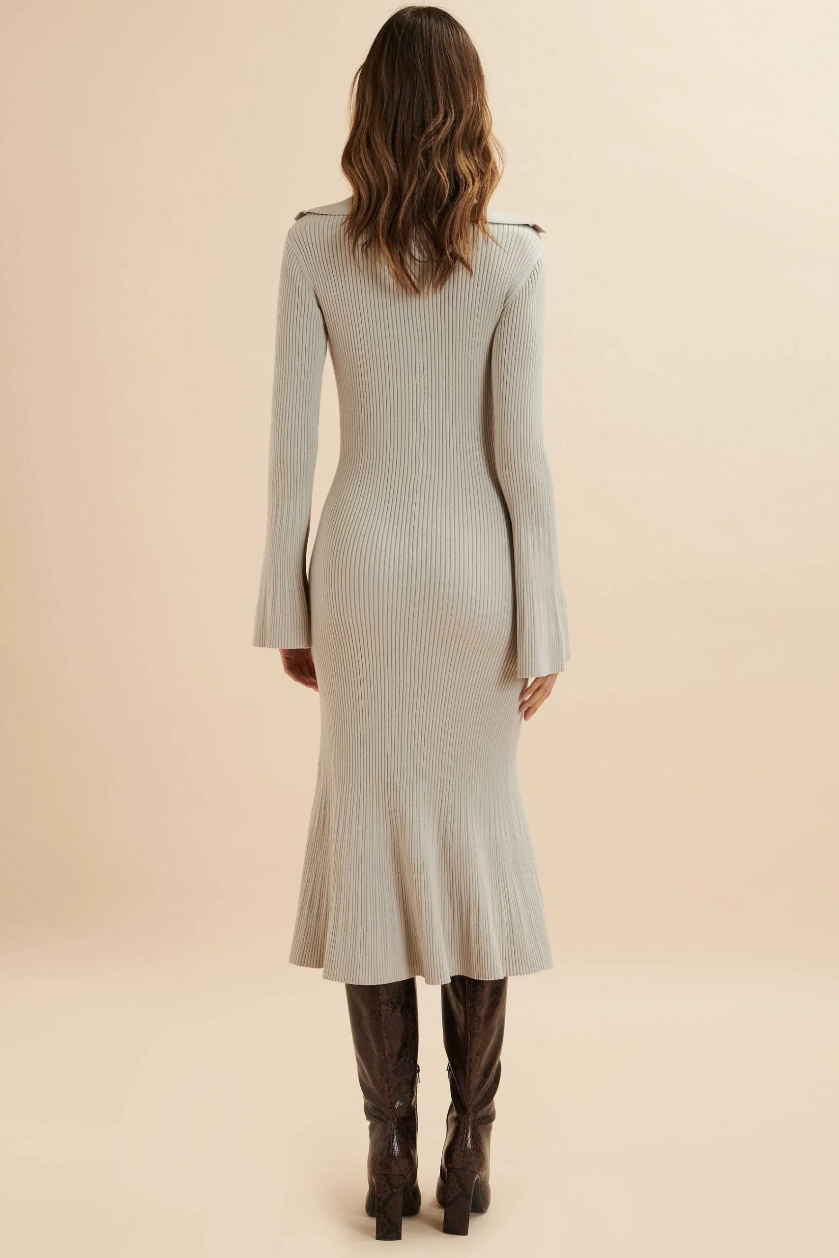 Expertly Crafted With A Luxurious Wool Blend And Intricate Knitted Construction, The Parker Dress Is A Stylish And Fitted Piece. The Ribbed Fabric Adds Texture And The Hammered Gold Buttons Add A Touch Of Sophistication. With A Flattering Fit And Flare Silhouette, Fluted Sleeves And Collared Neckline, This Dress Is Perfect For Any Occasion.