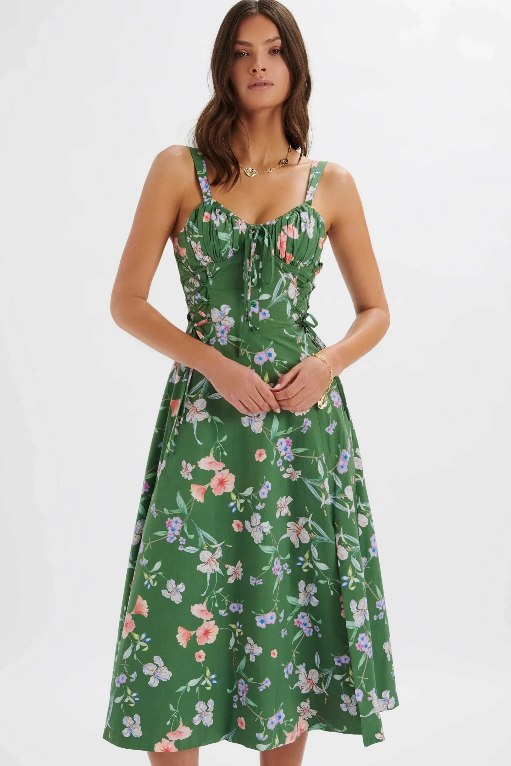 Expertly Crafted From Premium Woven Fabric, The Rosey Gathered Longline Dress In Green Floral Print Is The Perfect Choice For Races, Weddings, Or Any Special Occasion. Delicate Pleat Detailing And A Close-To-Body Fit Create A Flattering And Feminine Silhouette, While The Elegant Longline Design With Side Split Adds A Touch Of Sophistication. Make A Statement With This Stunning Green Floral Print Dress.
